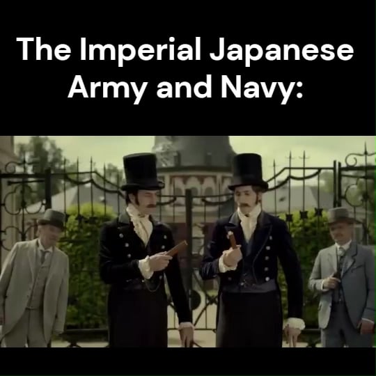 This period was rife with radical groups of fascist young army and navy officers opposing Japan’s modernization and liberalizations, competing Army/Navy interests, and multiple Sub-splits between the officers that did and didn’t go to Staff College, (educated elitists thinking dirty peasant officers were bellow them) and even Intra-Service Splits within the army and Navy of those following General A vs General B, (the Kodoha/Toseiha Split) because fuck you. In this period, multiple coups went off and 2 prime ministers were assassinated. So it’s more Everyone going “fuck you” to everyone rather than just army/navy.