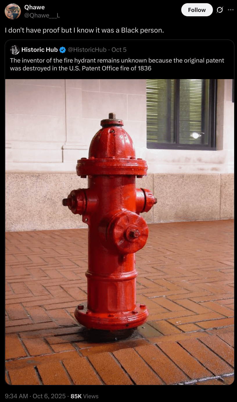 HighGnoller on October 7, 2025 3:08 am There is a level of irony, and not the funny kind, for the patent for a fire hydrant of all things to be lost in an office fire.