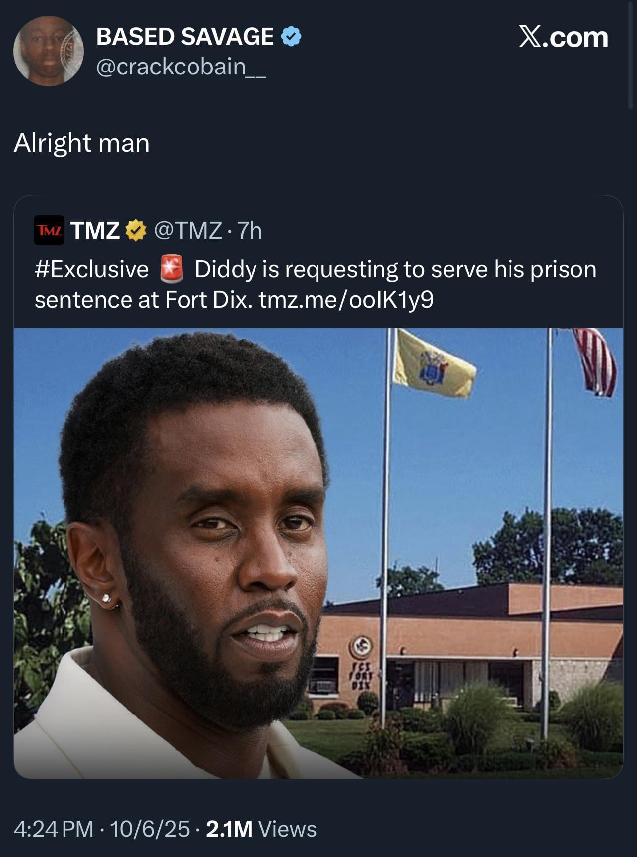 ExperiencePutrid4566 on October 7, 2025 4:42 am TMZ’s headline on the article was “Diddy: I wanna do hard time at Fort Dix,” I just lost it