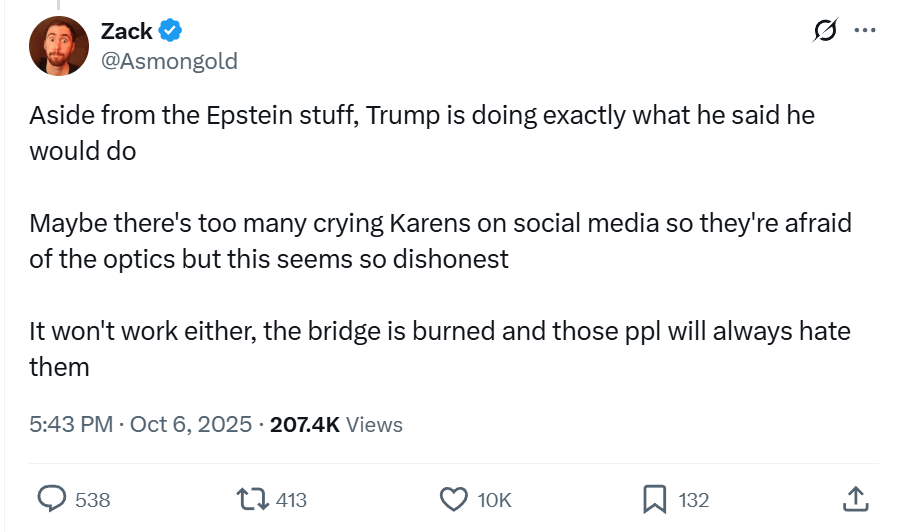 He’s not wrong about his fellow manosphere guys trying to walk it all back with “I didn’t know he was going to do all that stuff he said he was gonna do”, but I should also point out that Trump said repeatedly that he didn’t want to release the Epstein stuff even before he was elected. So he’s keeping that promise too.