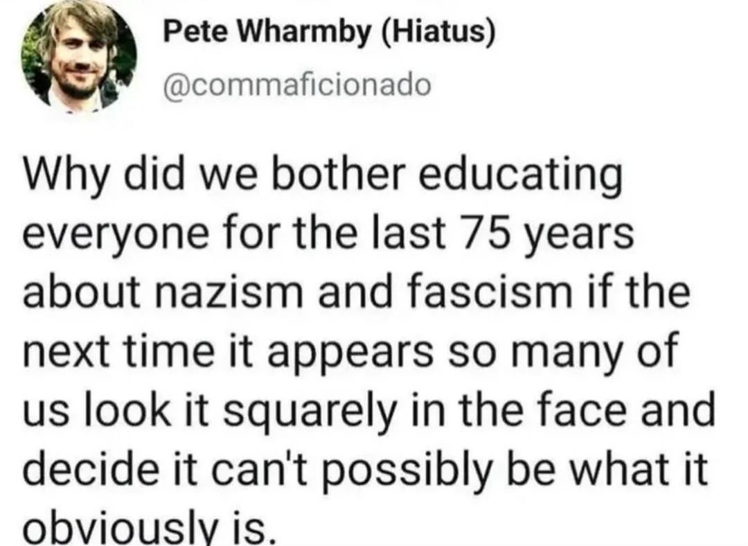 It’s because of how they packaged it. It’s not “in your face” like people think. Hitler didn’t suddenly start encouraging hate. He (well, his advisors, he was too busy grandstanding and being a pain in the bollock~~s~~) he groomed people, and then he seized on every opportunity presented to him. Likewise, Donald Trump did the same thing. In 2016 it was to raise his profile and show the world he still had massive influence (and to line his pockets), and now, in 2021 it’s to avoid prison.