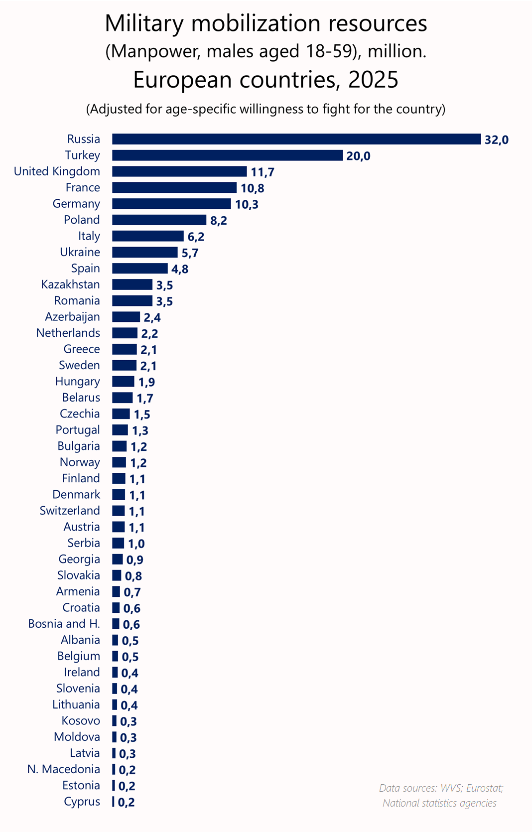 How many millions of European men aged 18-59 will fight for their country / Resources for military mobilization (Manpower, males aged 18-59), million, European countries (1+ million population), 2025, adjusted for age-specific willingness to fight for the country (according to WVS research) [OC]