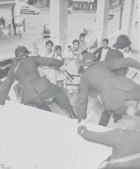 South African police jump into action in an effort to protect a group of South African-Indians from a mob of Black racists during the Durban Race Riots of January 1949, where Indians were murdered and their homes and businesses pillaged. [474 x 942]