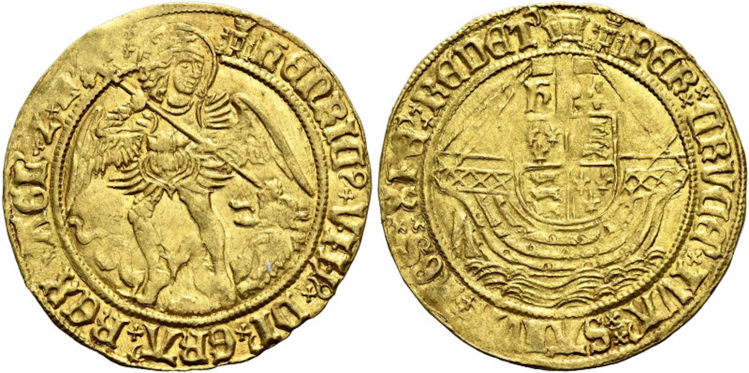St. Michael, spearing dragon, crosslet ends to spear, two saltires by nimbus, HENRIC?. V.i.i.j?. DI’. GRA’. REX. AGL’. Z. F’, rev. PER: CRVCE’. TVA’. SALVA: NOS: XPE’: REDET’, ship bearing royal arms, cross on mast above, dividing H and rose, saltire stops both sides. 5.17 g.