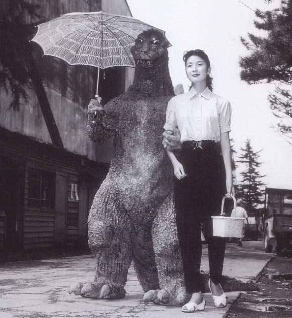 Haruo Nakajima and Momoko Kôchi on the set of Godzilla (Gojira), 1954