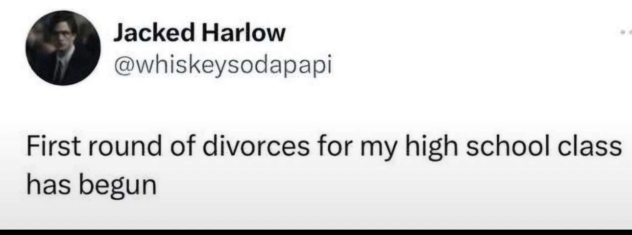I shouldn’t find this as funny as I do. Almost everyone bar maybe two couples that i know, who got married before they were 25, are all divorced.