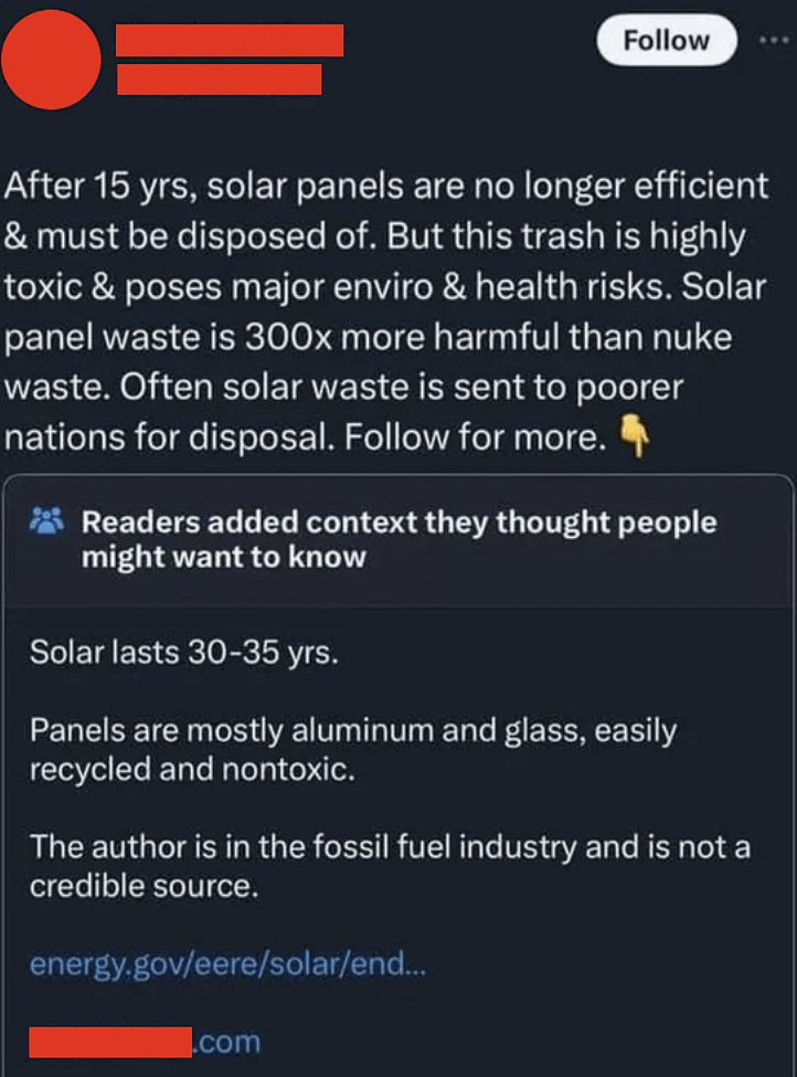 You don’t even need to be particularly social media savvy to identify this as fossil fuel propaganda. You really just need the most basic logical thinking skills to realize that there’d be no possible way solar panel waste could be “300x more harmful than nuke waste.” This is such an incredibly dumb statement to make that I’m just shocked how people seemingly completely lost the ability to feel shame