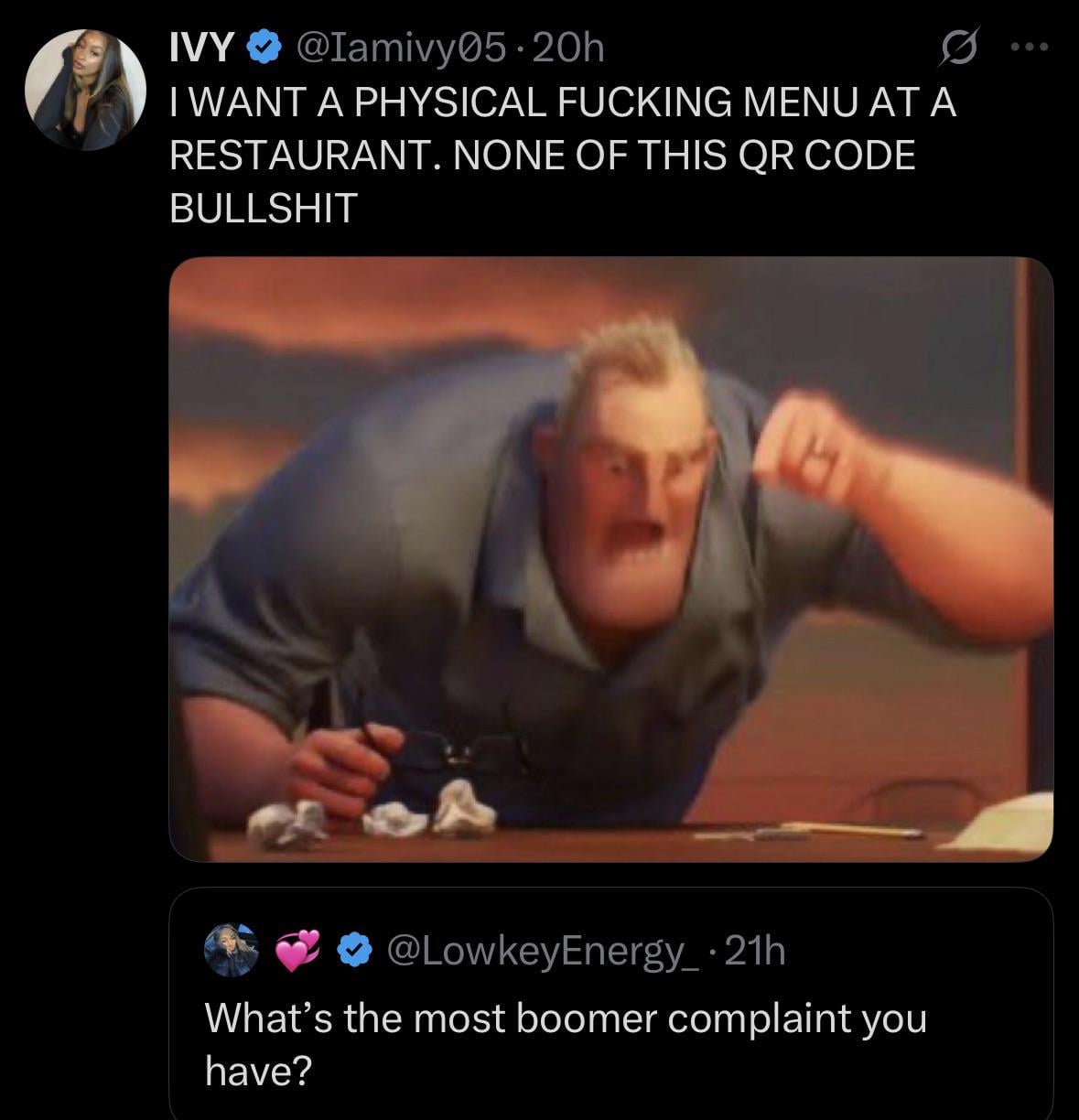 12. Nah, no way, give me QR codes or don’t even ask me to come in. Especially since where I’m from, the codes give menus that are updated live. Plus you can order directly instead of having to wait for some boomer trying to order as if it’s their first day on earth before the waiter can finally help another customer