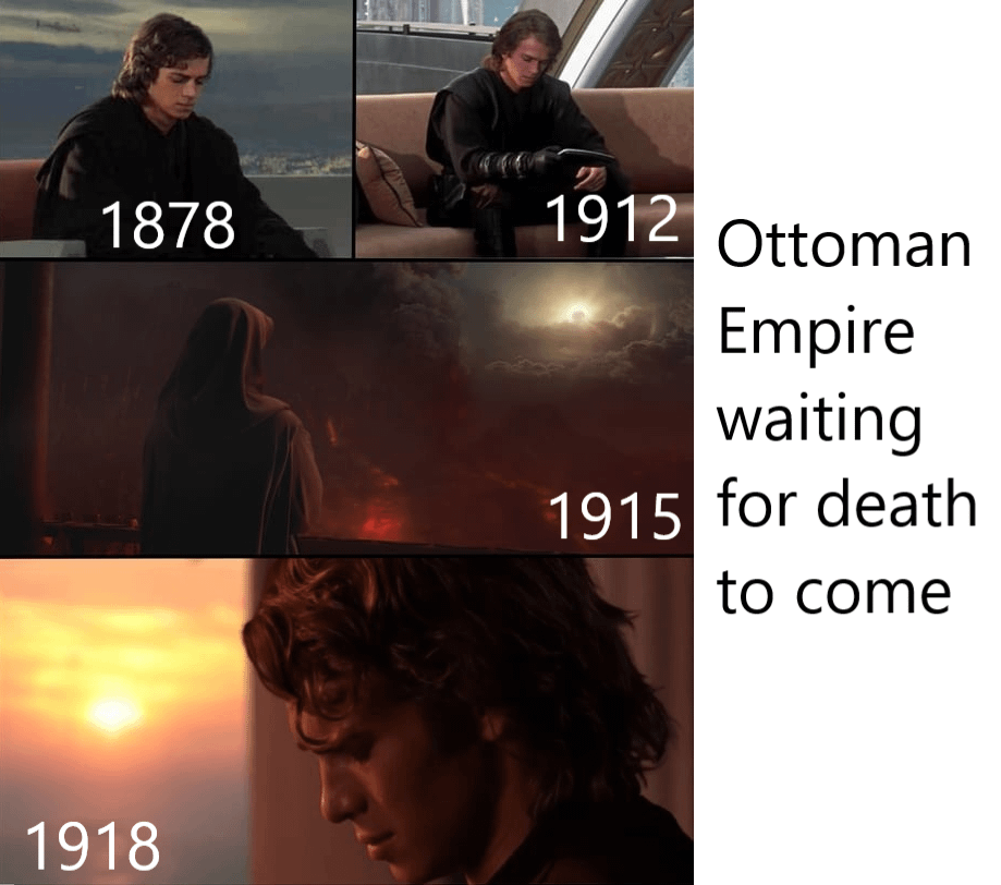 The Ottomans actually ended in 1922, they managed to outlive their historical adversaries the Austro-Hungarian and Russian Empires