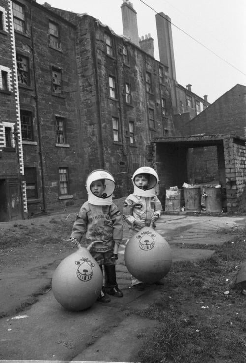 Boys in Glasgow backcourt with Christmas presents (astronaut suits & Space Hoppers), 1970s by wrongturnz