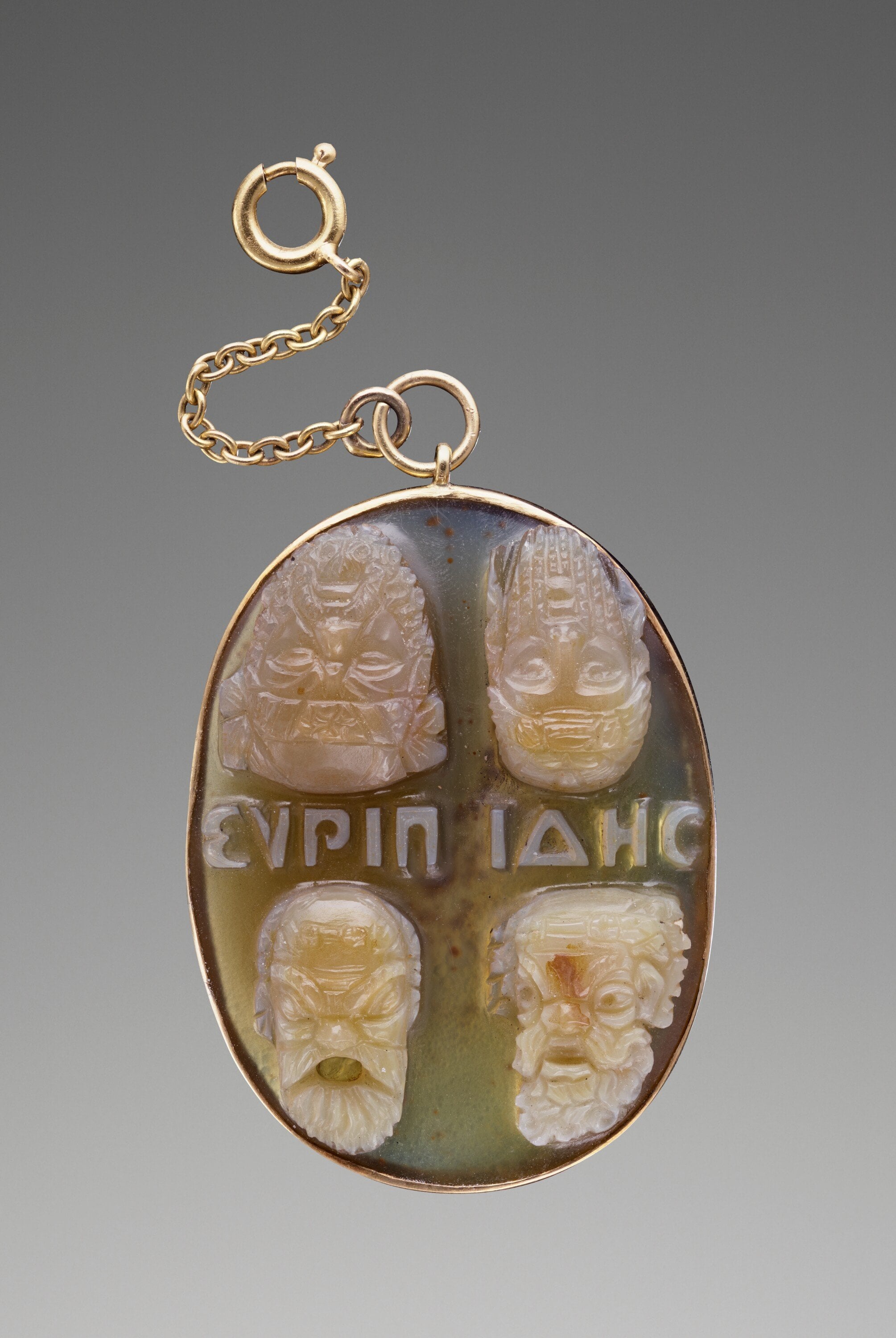 >Carved on this cameo are two pairs of theatrical masks separated by a Greek inscription that reads: “Euripides,” the name of the Athenian playwright. One pair of masks depicts the faces of two satyrs… the other two masks are human faces.