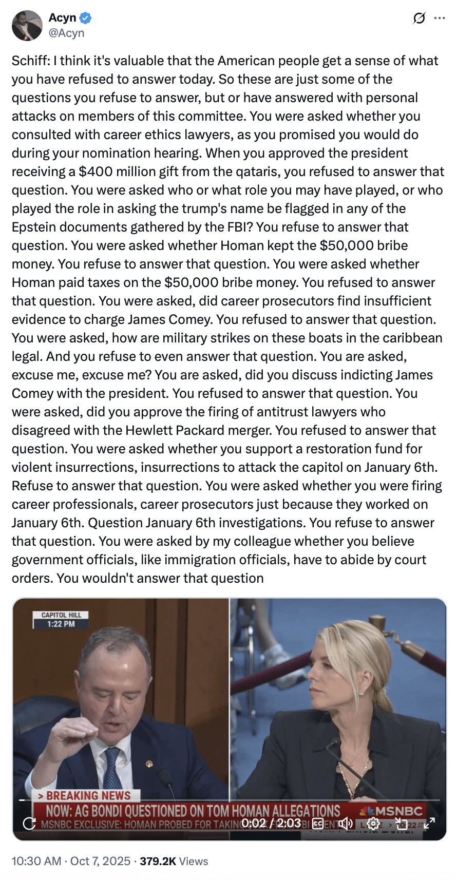 Schiff is also one of the people that Trump demanded Bondi indict in his Truth Social rant last week. Schiff isn’t fucking around. More of this energy, please!
