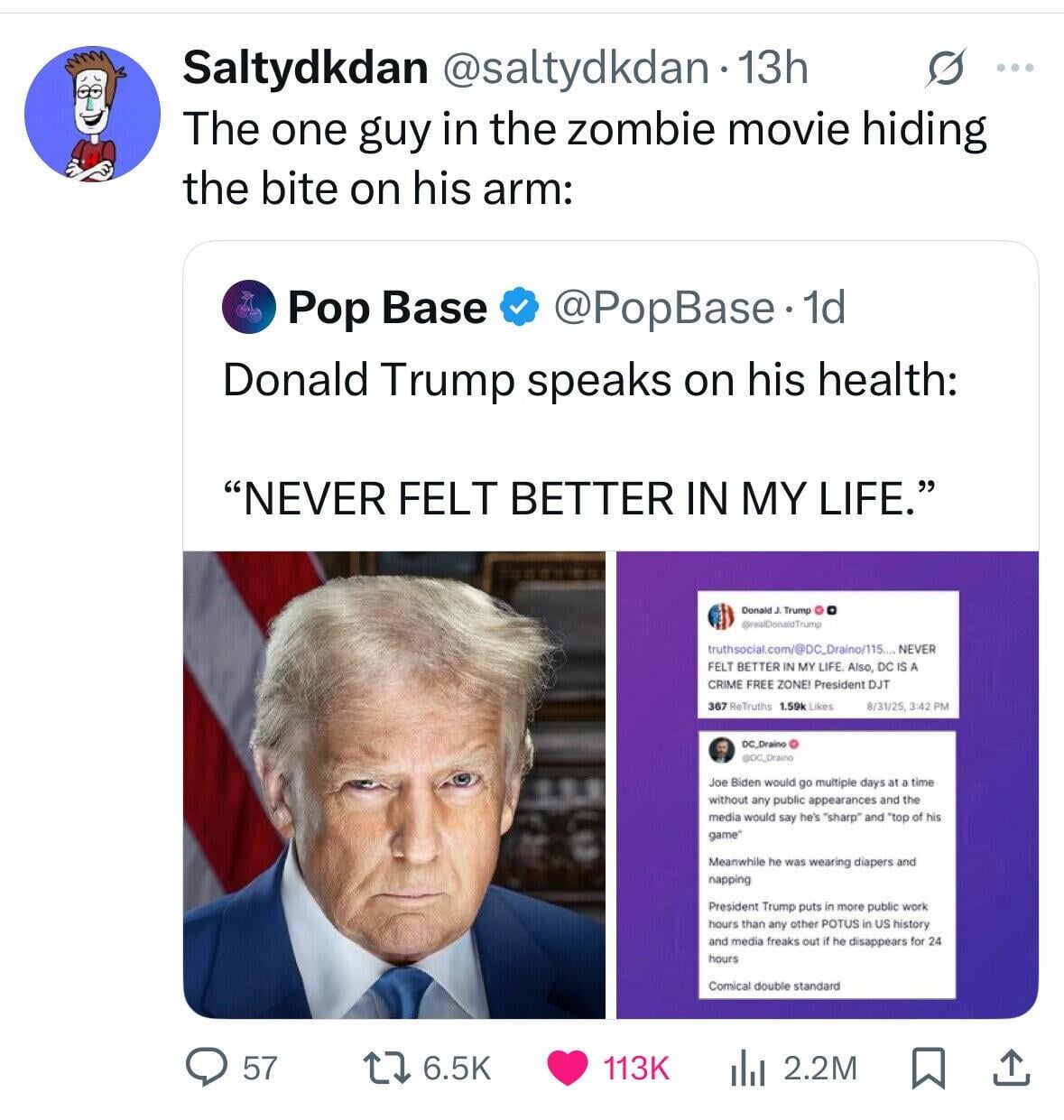 Yeah, just take time to imagine that Trump is in your group of people surviving the zombie apocalypse. Not only is he going to hide the fact he just got bit, he will also be stealing and hoarding the rations.