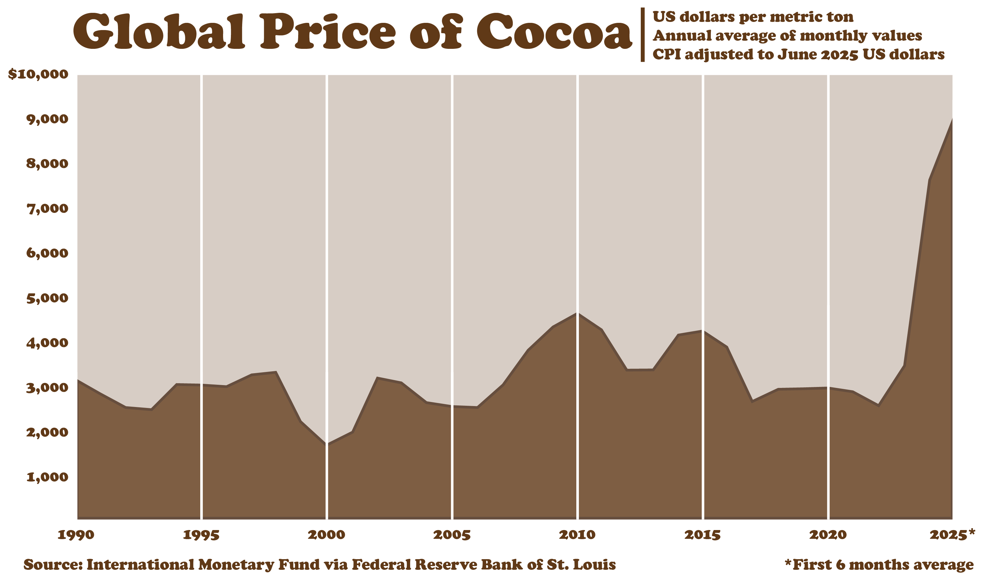 Created in Illustrator. Data Source: International Monetary Fund via FRED. Monthly values averaged by year, adjusted for inflation relative to June 2025. [https://fred.stlouisfed.org/series/PCOCOUSDM](https://fred.stlouisfed.org/series/PCOCOUSDM)