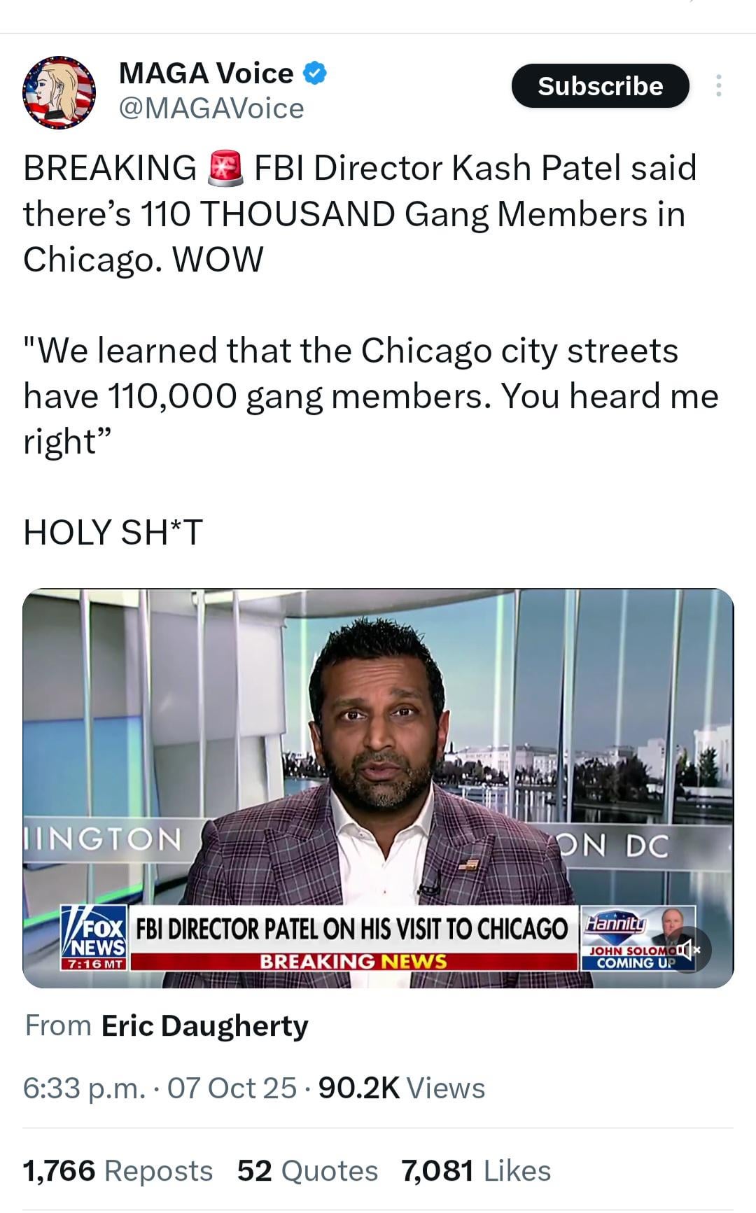 FBI Director Kash Patel said there’s 110 THOUSAND Gang Members in Chicago