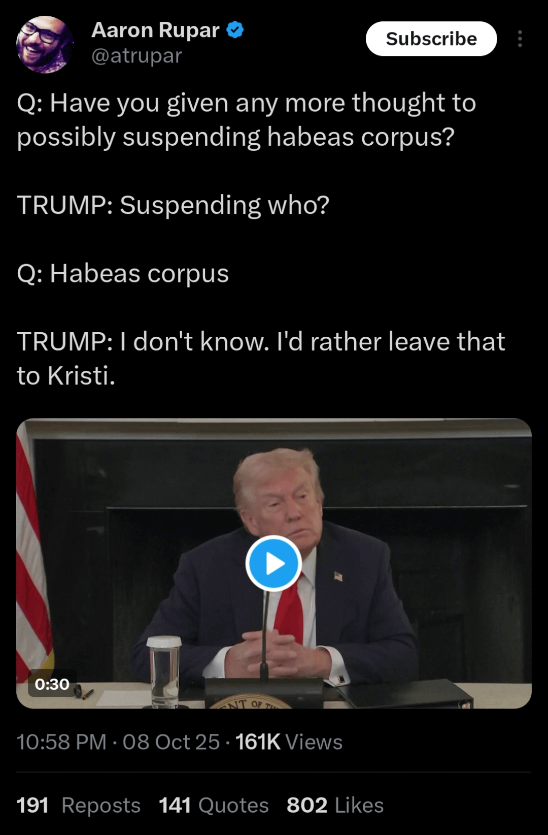 You libs just don’t understand. He’s playing 5D chess, and just pretending not to know what Habeaus corpus is.