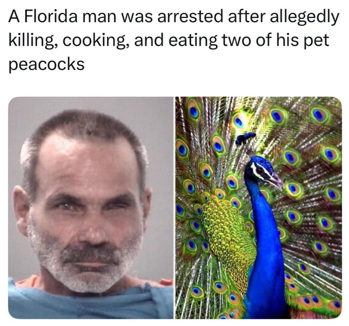 “While he was being taken to jail, the man told deputies that he would kill all of his pet peacocks upon release to prevent anyone from taking them, the sheriff’s office report said.