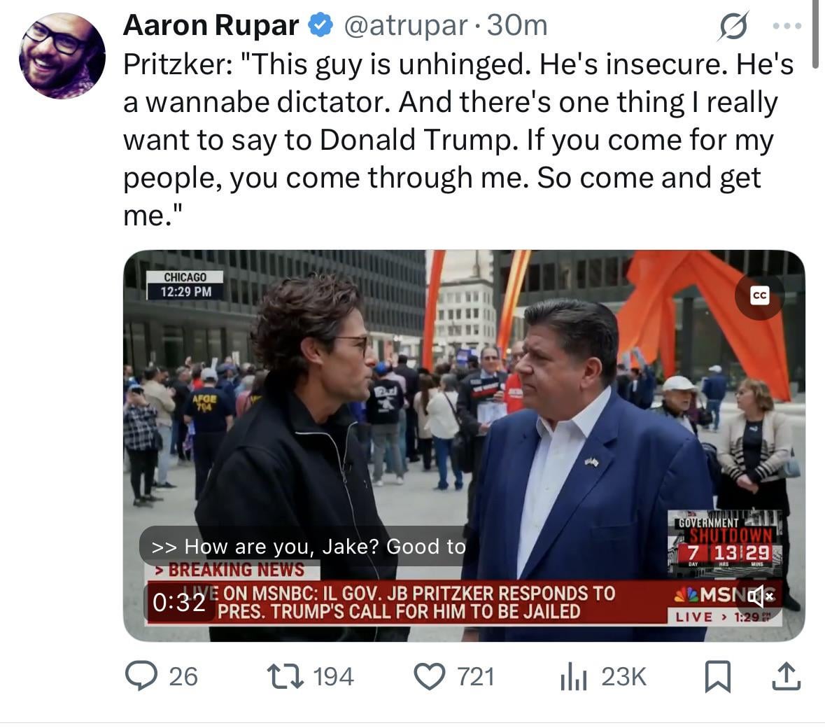 Pritzker has assured his political future, that’s for sure. A democrat with balls is a necessity now. The corpo dems need to go, along with maga.