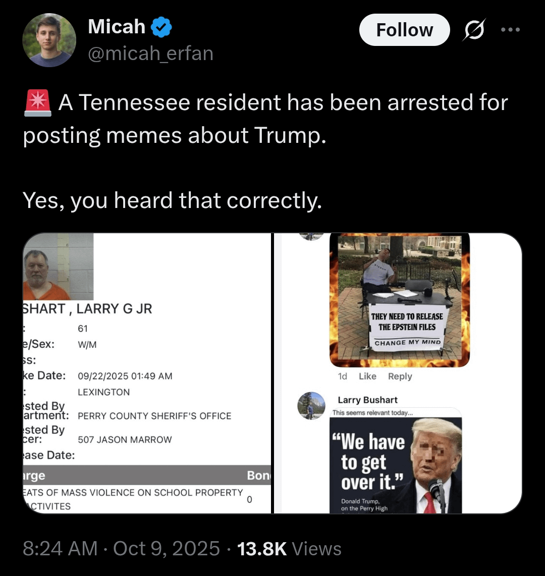 Tennessee man arrested for posting meme ‘threatening violence’ in Facebook group for Charlie Kirk vigil | The Independent https://share.google/ZoztwxbRlJoseQkh0