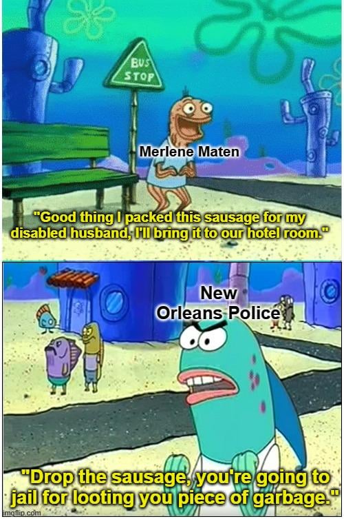 Merlene Maten of New Orleans was a 73 year old Deaconess. During Katrina, she and her disabled husband evacuated to a hotel on higher ground. Packing the recommended 3 days of supplies in her car, they stayed in the hotel during the storm. When Maten went to get some sausages from her car, she was arrested by police and accused of looting. Her bond was set at $50,000 despite the police having no evidence of her looting. She was freed after public outcry but not before spending 16 days in jail.