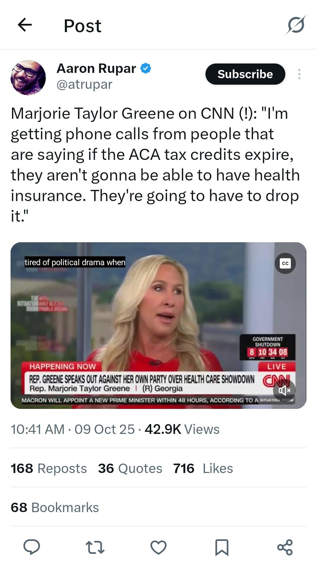 She is only pissed about this bc her adult children would have to pay an absurd amount of money for insurance if the subsidy isn’t extended. and like any rich person; she believes the government should only give the rich benefits but not collect any tax in return
