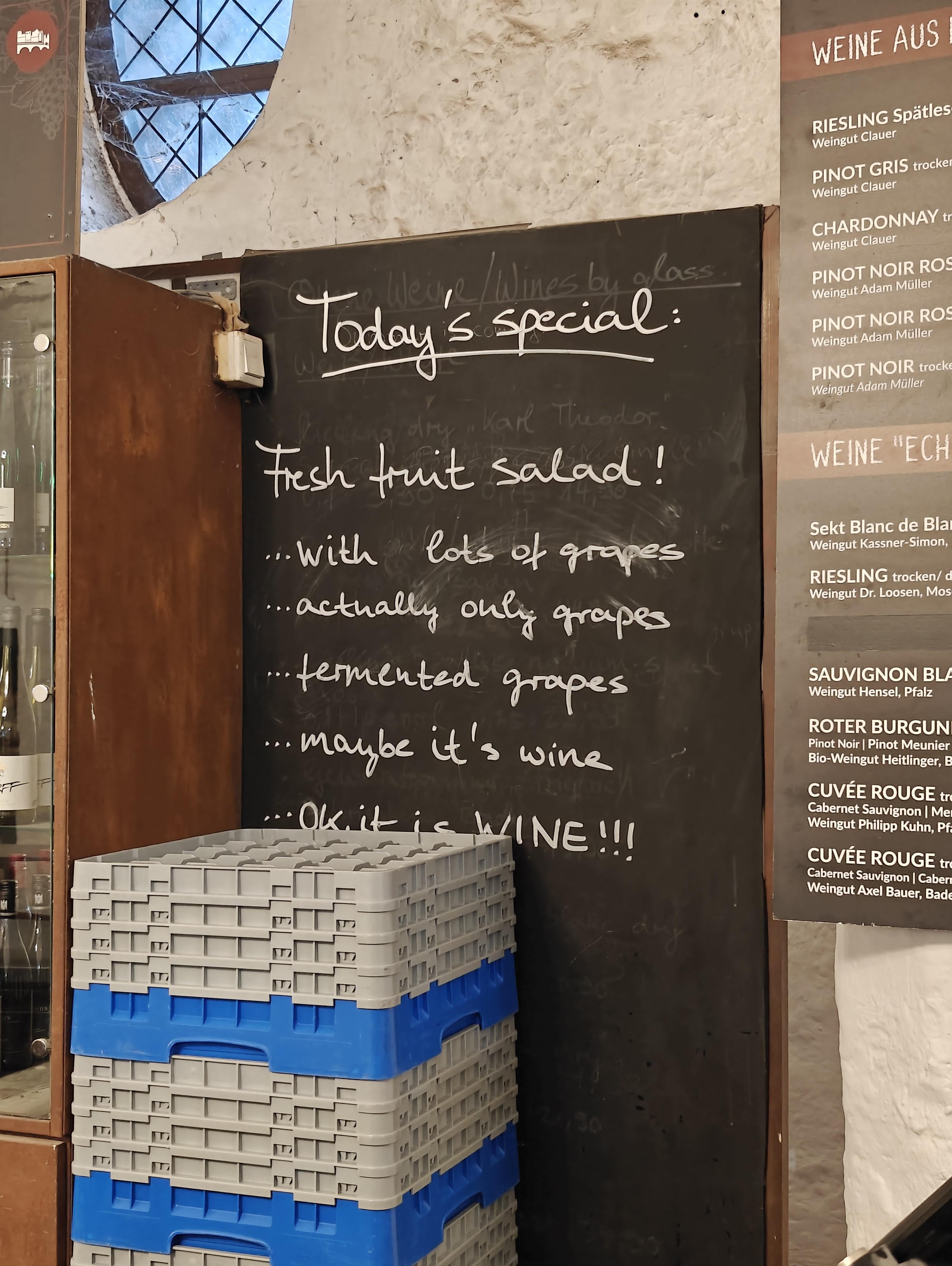 Love a menu with humor… I’d take either fruit salad or wine.Â