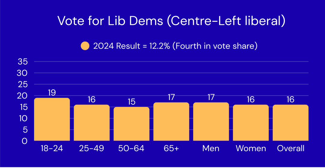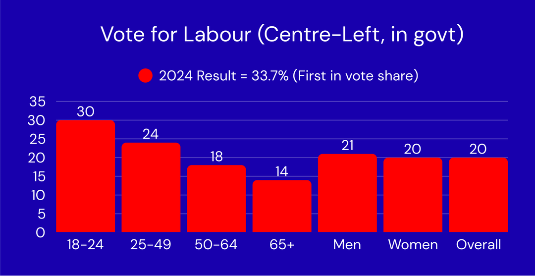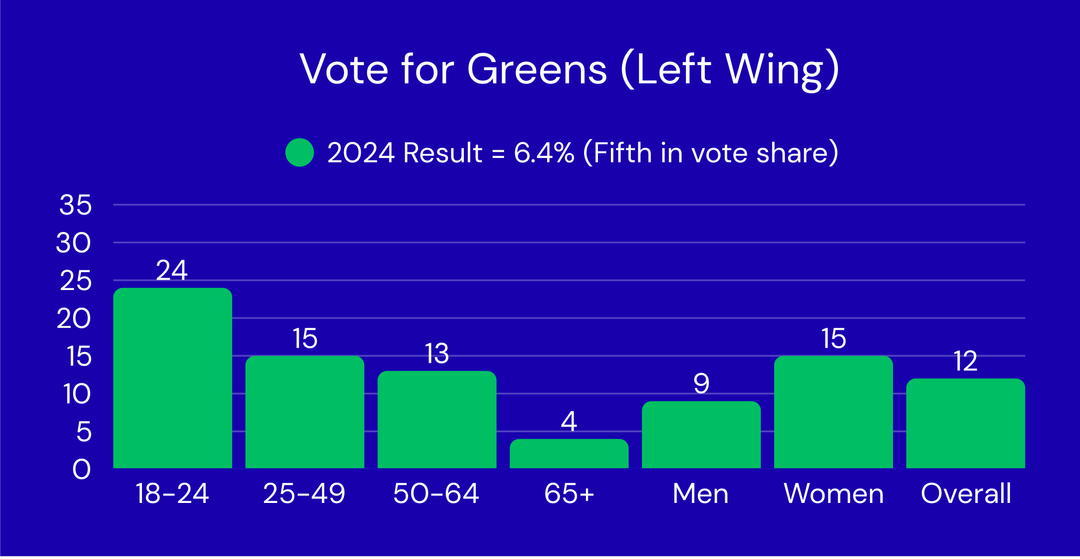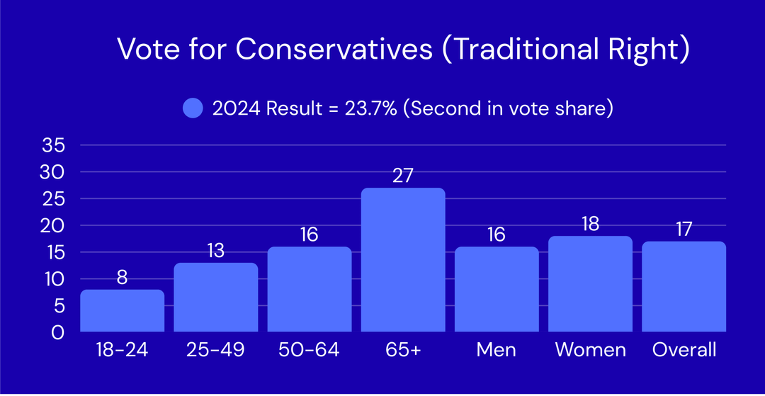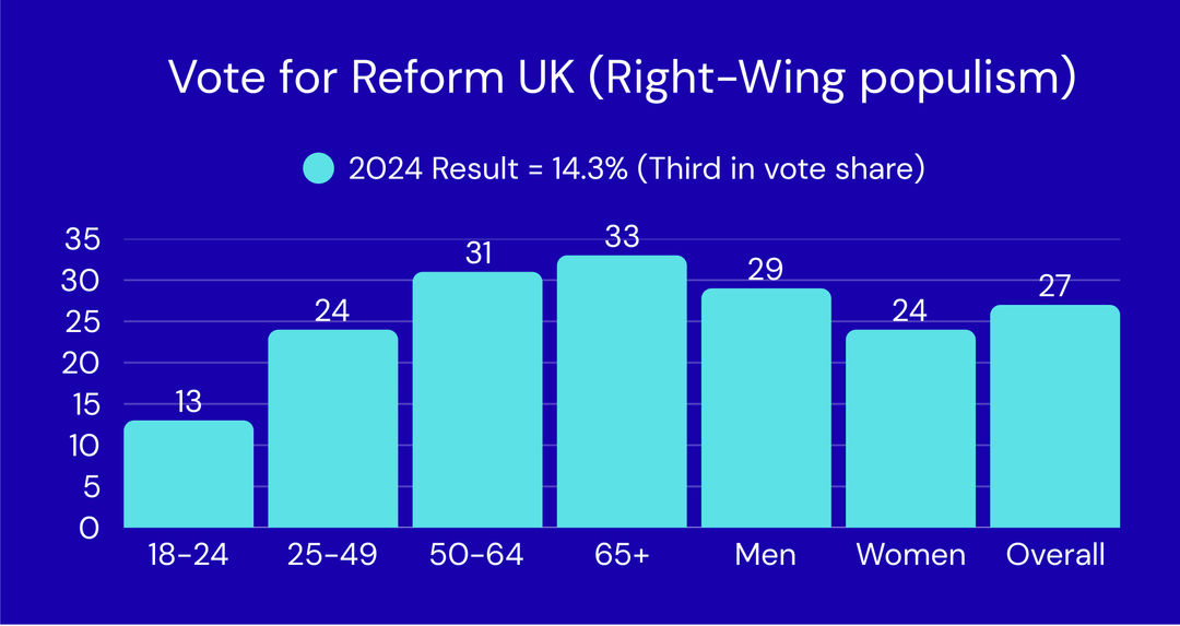 [OC] YouGov UK: Voting intention for the next UK general election, by demographic. Right Wing reform leads by 7 points. Conservatives fall to fourth place with men as one in four young Briton intends to vote for the Greens. Governing Labour sinks to worst result since last election.