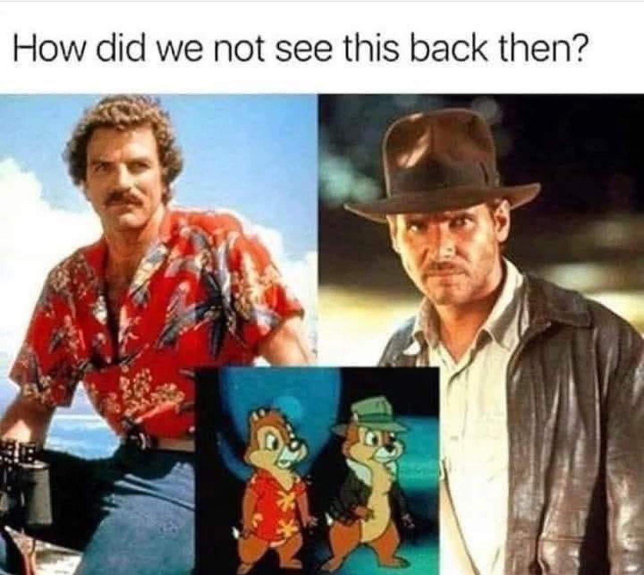Well at the age when I was watching Rescue Rangers I wasn’t allowed to watch Indiana Jones (I only knew about it because of the Indiana Jones Stunt Show in Disneyworld scene from the Full House episode), and didn’t know Magnum PI existed. I also wonder why I never picked up on the direct references to mob movies and fight club that were in the cartoons I watched as a kid as well.