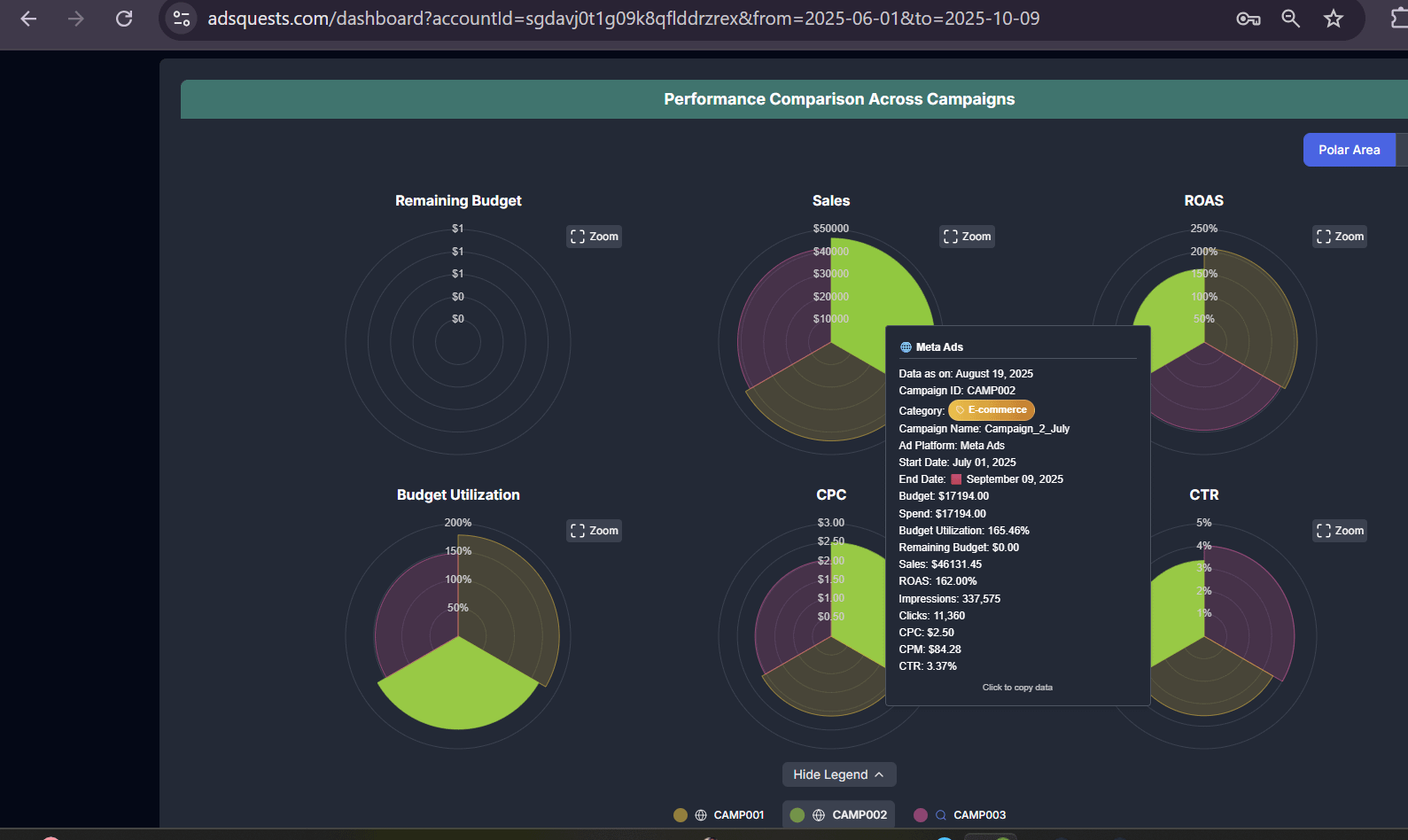 This visualization provides a quick, comparative view of three different ad campaigns (CAMP001, CAMP002, and CAMP003) across six key metrics. It uses a polar area chart format to make it easy to see the performance spread and compare each campaign's contribution to metrics like sales and ROAS.
