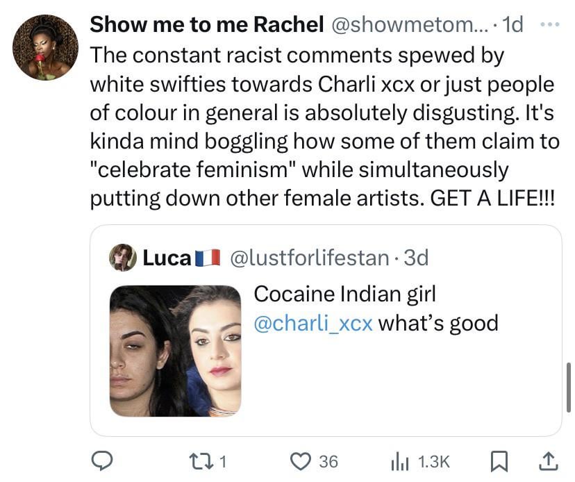 I mean Charli is the one hanging out with Matty Healy and married to his bandmate, a whole group of racist assholes. No one can control what the fringes of their fanbases do, especially with one as insanely large as Taylor’s. I just think making Charli out to be some victim is laughable. She’s racist and problematic af but its more cool to hate Taylor. 🤷🏽♀️