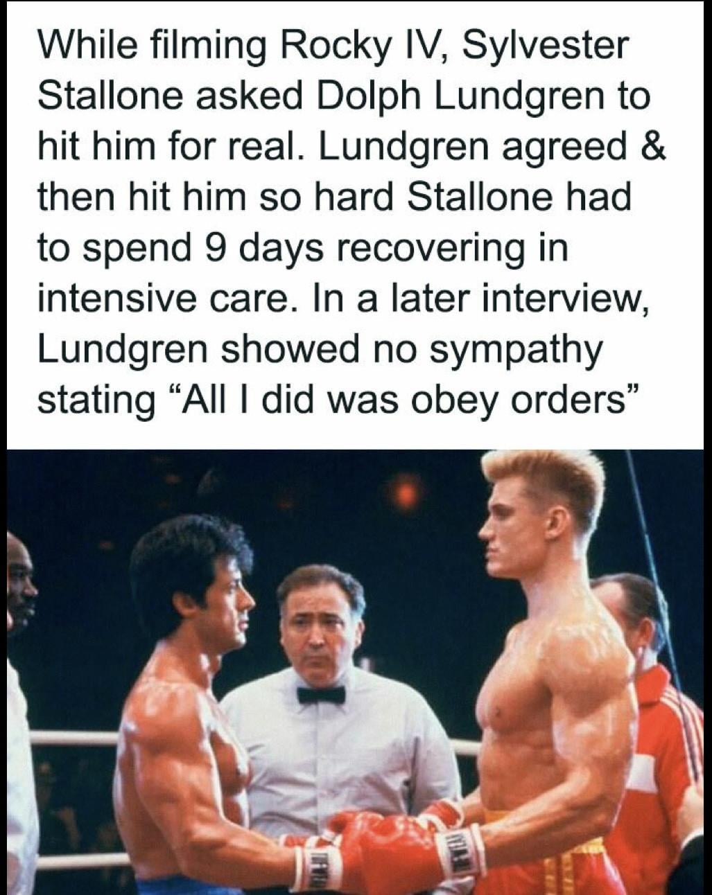 Stallone was hit in the chest by Lundgren. Later that night Stallone’s heart swelled up and his blood pressure skyrocketed. He had to take a low altitude flight to the ER and he was admitted to the ICU. He had a bruised heart from the impact. Stallone described it as being hit by “a streetcar named Drago” and that his heart stopped momentarily during the initial impact.