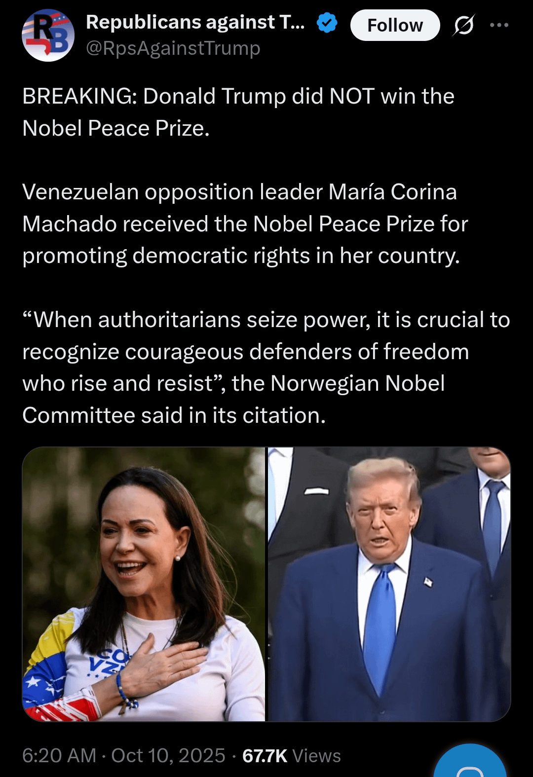 “Fake News! They stole the election. We have evidence of members of the Nobel Committee stuffing the ballot box! These people are sick, they hate peace, I stopped 9 wars, oh yeah, 9,000% tariff on Switzerland starting now!”–DJT