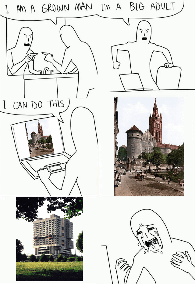 At least karma struck back at those Soviet bastards for destroying the castle and that architectural abomination they erected in its place was never actually finished – sure, they slapped a new paint on it here and there this one time for Putin’s visit, maybe even made one of the elevators working, but that’s basically it. Moreover, the whole building was slowly tilting and sliding due to the ground being unstable from when the castle’s tunnels were blown up. No wonder they finally tore the whole sorry thing down last year.