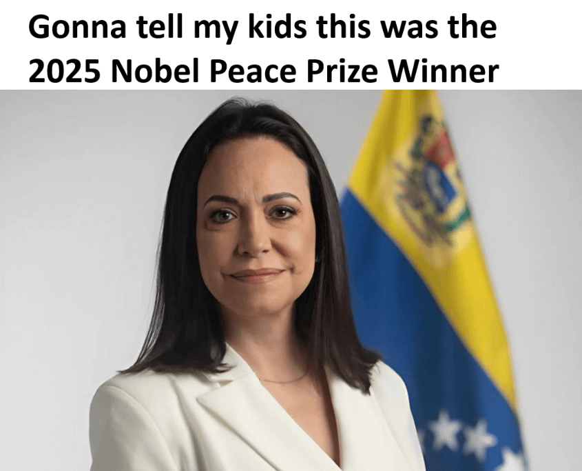The_Dibsomatic on October 10, 2025 6:31 pm Congratulations to them for winning but i have zero idea who that person is or what exactly they have done to earn the Nobel peaceprice.