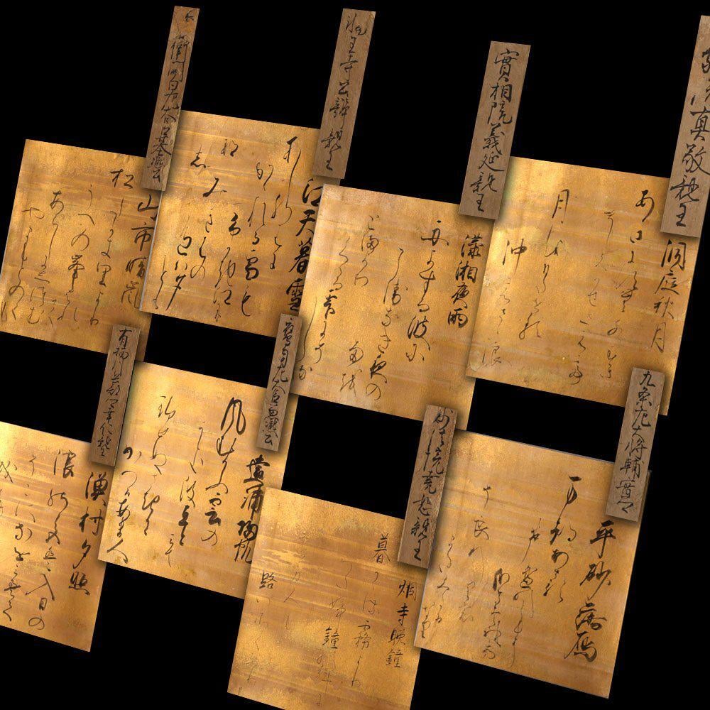 The Eight Views of Xiaoxiang, In Eight Decorated Shikishi Pieces, 1690-1691. A Manuscript Set of Poetry with Calligraphy by Imperial Princes and Nobles of Japan. Attributions include Prince Arisugawa Yukihito; Takatsukasa Kanehiro; Cloistered Prince Takajo; Kujō Sukezane, and others [1000×1000]