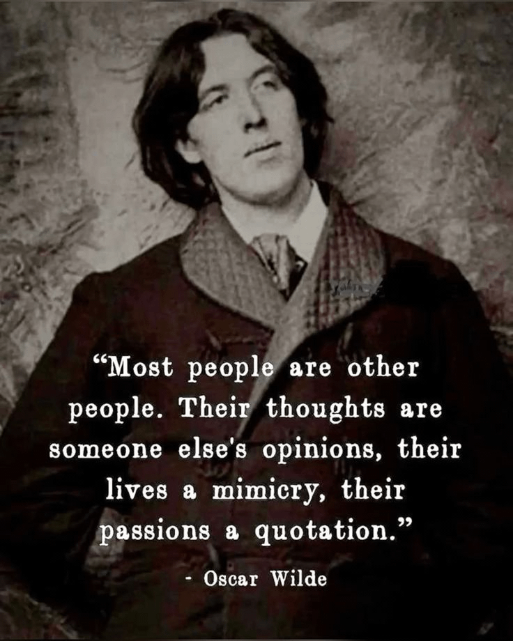 I love Oscar Wilde. Picture of Dorian Gray is and has been my favorite book for the better part of the last 2 decades. I dislike this quote. It’s pretentious and unknowable. All people are a conglomerate of other people and from that your own identity of your selected characteristics. That’s okay, that’s how it ought to be.