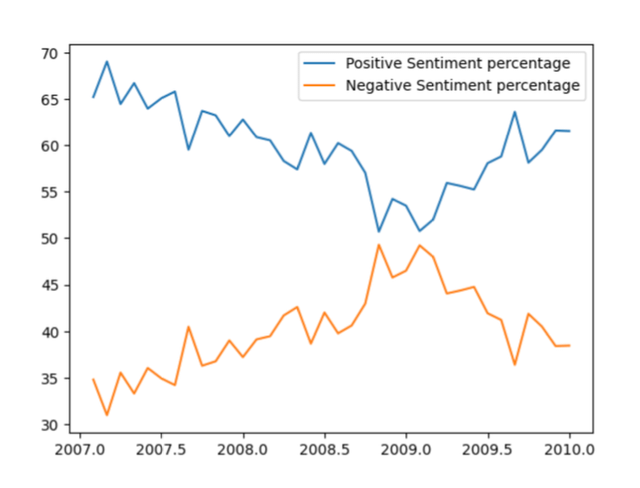 The sharp fluctuations where positive and negative sentiment get flipped correspond to the DotCom crash and 2007 recession.