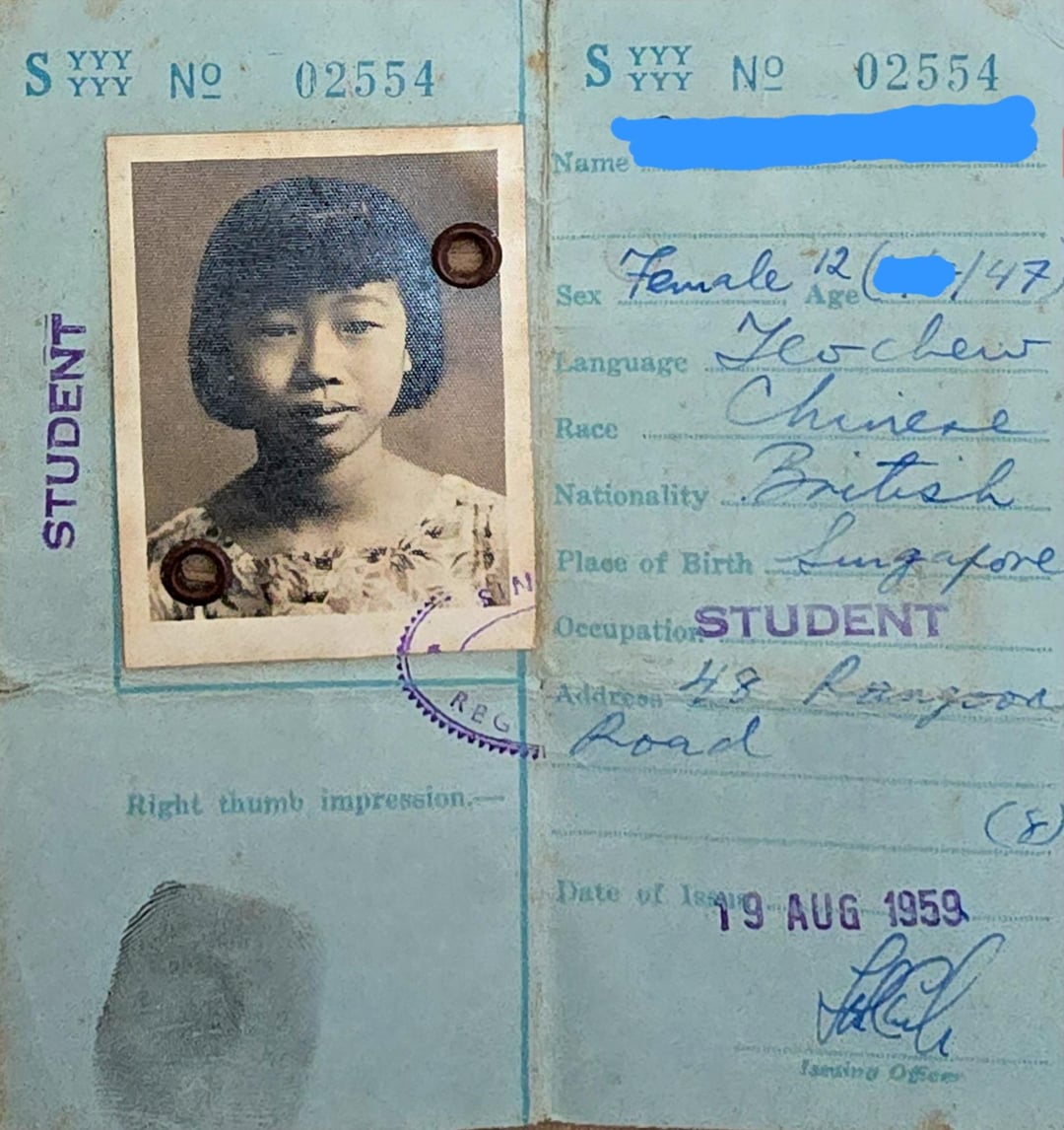 My Grandma’s student ID from 1959 British-colonial Singapore