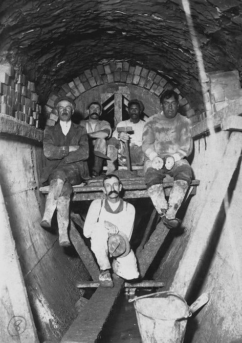 Construction workers in a Auckland Metropolitan Drainage Board sewerage tunnel, at Orakei, Auckland. Auckland Metropolitan Drainage Board: Views of construciton of Orakei Sewerage Works. Ref: 1/4-012557-F. Alexander Turnbull Library, Wellington, New Zealand. [/records/23172488](https://natlib.govt.nz/records/23172488)