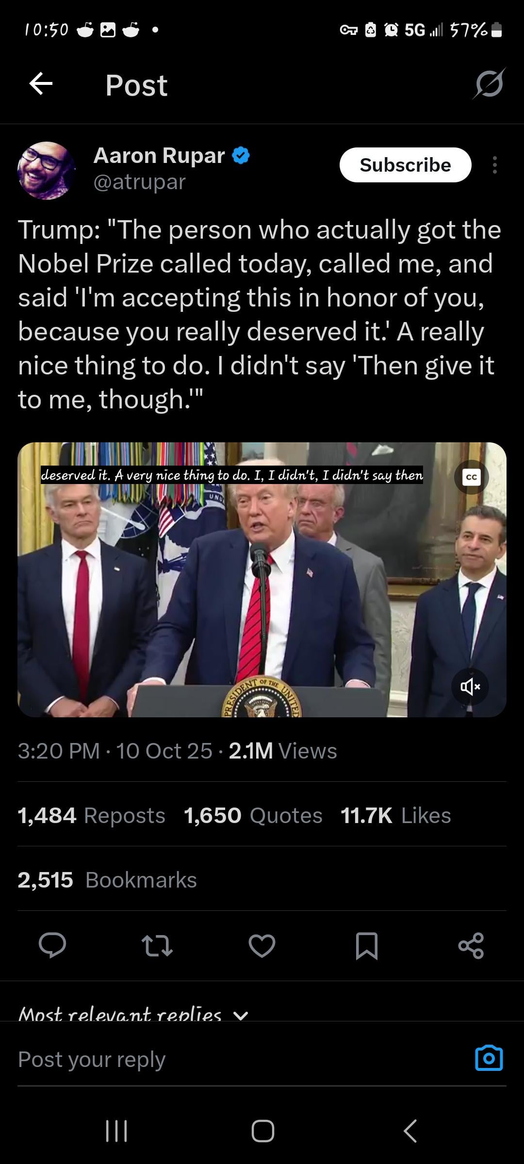Playing n-dimensional chess, the Nobel Committee could have given him the Peace Prize as a gamble that he would be locked into resolving the situation in Gaza. That said, I can’t believe that anyone anywhere gave any credence to Trump’s moronic suggestion that he even be considered. Karma is going to come for him hard, and it is not going to be in the form he thinks.