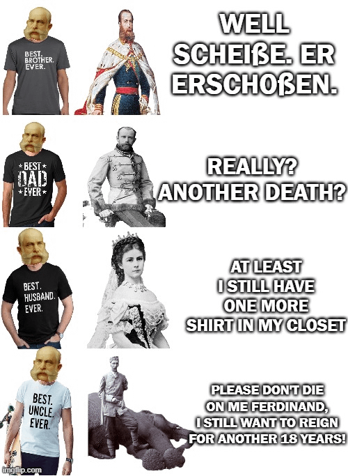 By 1898, Kaiser Franz Joseph was getting quite the high numbers of relatives who had been killed. He staggered on though. by Awesomeuser90
