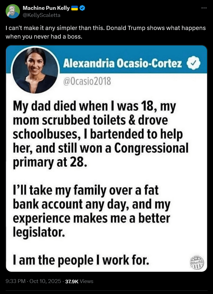 I may not agree with everything AOC says but at least she has ideas and that’s enough for me. That and she irritates old white guys.