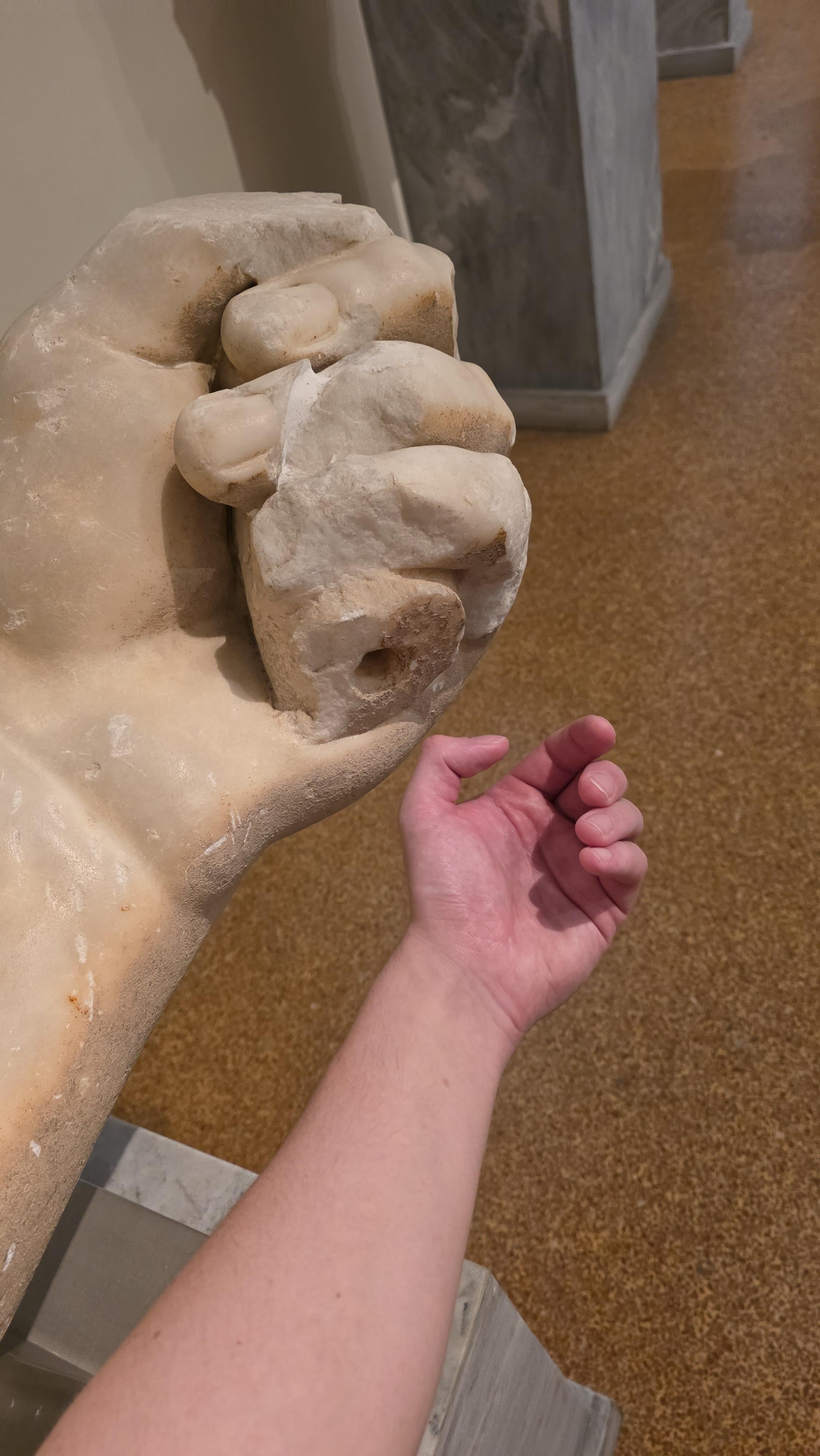 [2252×4000][OC]arm from a colossal statue of Zeus. It would have held a scepter in this hand. Second half of 200 BCE (my arm for scale)
