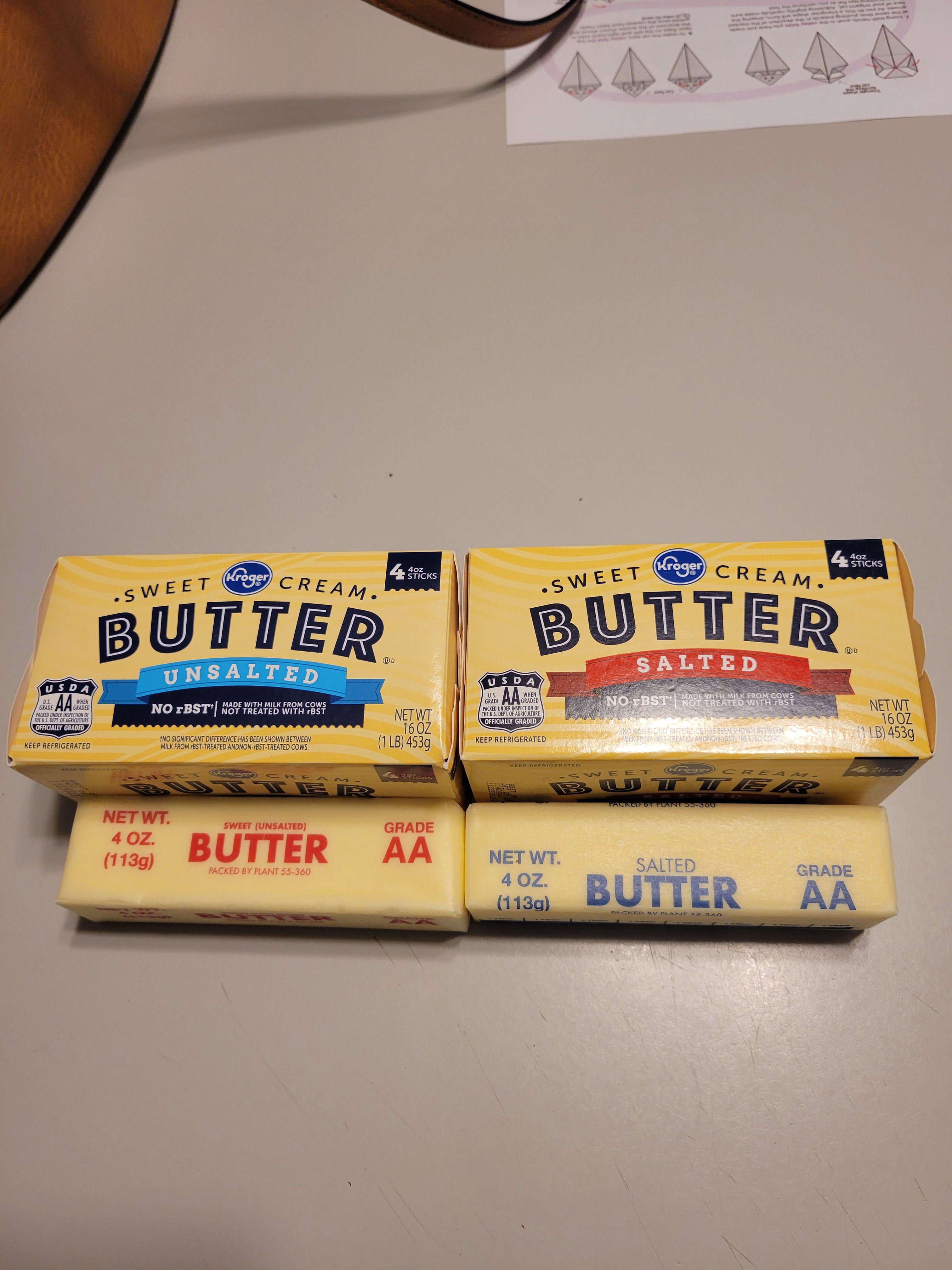 That’s actually super interesting to me, the salted kroger butter I’ve bought recently had all black lettering on the stick wrappers instead of red or blue. I wonder if they changed it, or it’s different by region?