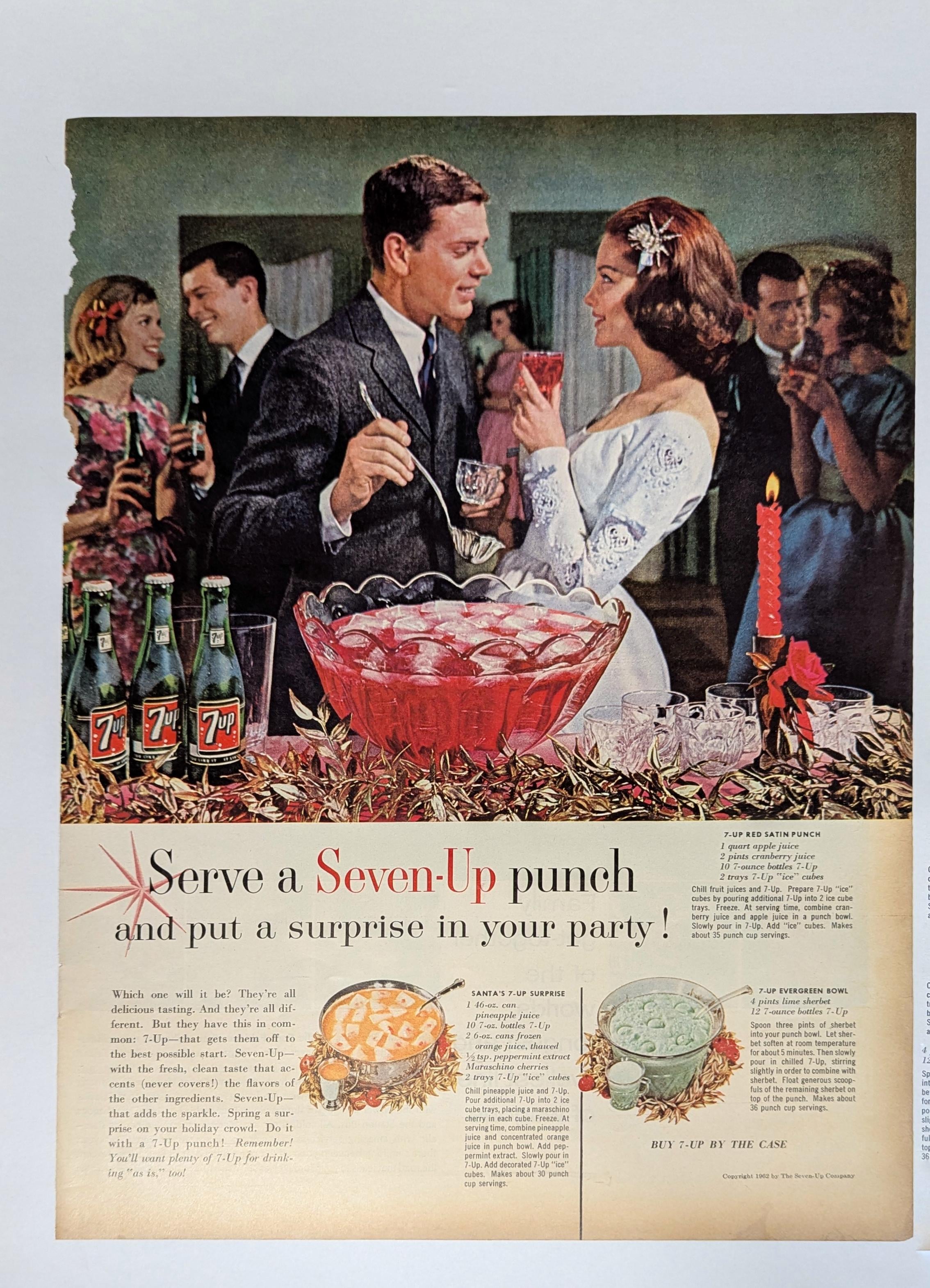 This vintage 7-Up ad captures the holiday party spirit of the early 1960s. It promoted using 7-Up as the base for festive punch; calling it the “best punch start” and highlighting how it added a sparkling flavor boost. (I remember these as a kid in the 70s.)