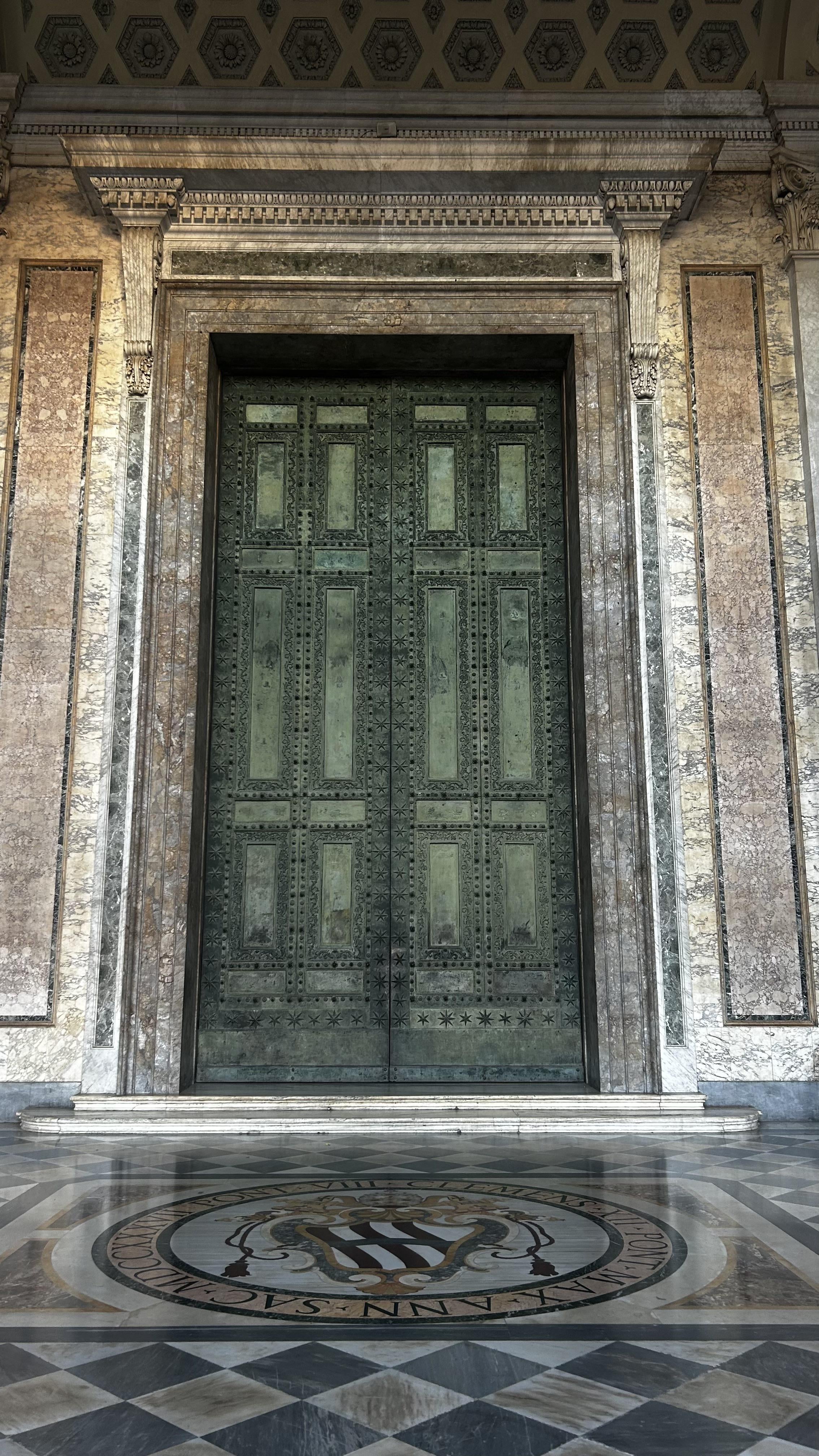 The massive bronze door, produced for the Curia Julia during the reign of Domitian (81-96), was moved to St John during the papacy of Alexander VII (1655-67) and are still in use today. The door is so well balanced that it only takes one person to open it despise its weight.