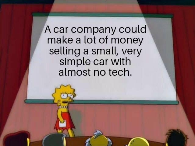 You think they will. But they won’t. If they did you’d just buy a base model for a ford maverick, focus or Honda civic, Toyota Corolla, etc. people are paying for the extras hence why manufacturers still provide them. For 20-30k these cars can be had. Accounting for inflation in 1980 a car was 7-8,000 new which is 27-31,000 in today’s money.