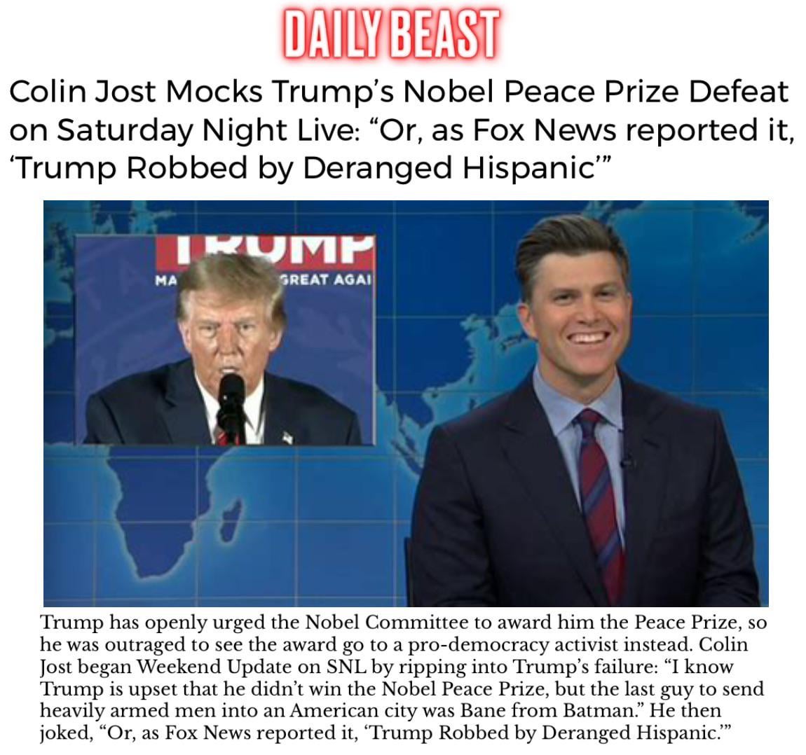 LOL, Colin Jost throwing shade like it’s sunny in Gotham! 😂 The real Nobel Peace Prize is the memes we got along the way.