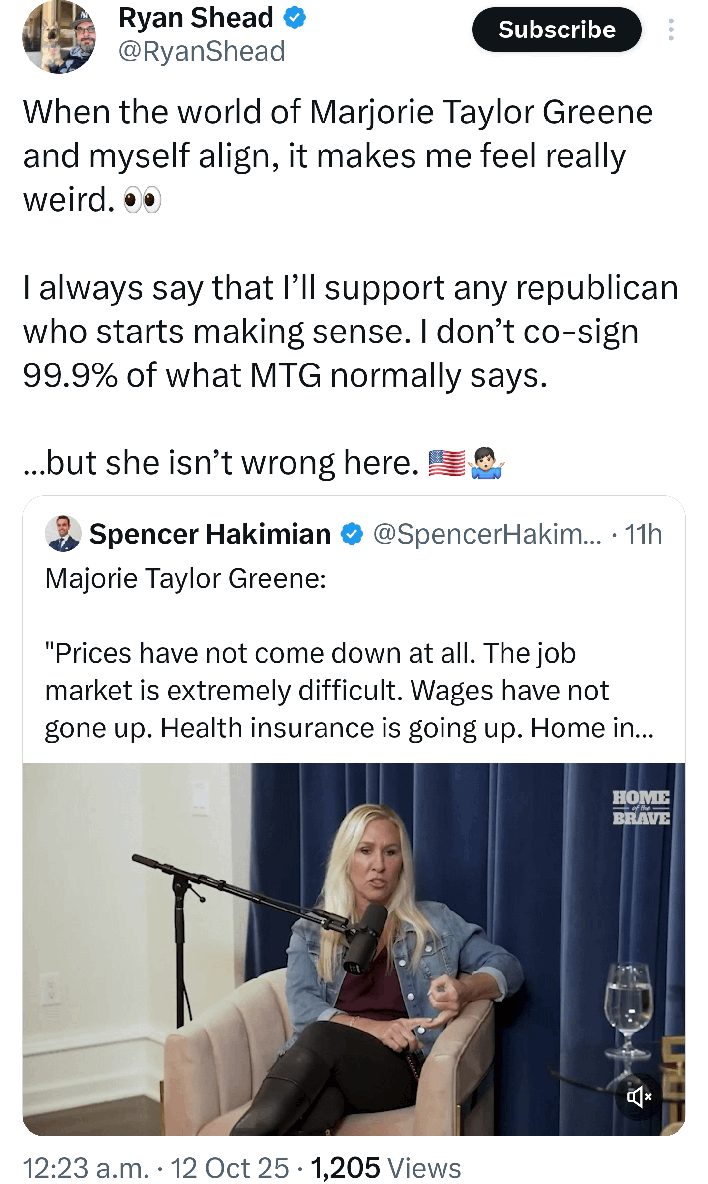 I can’t stand her, but she’s continually railed about the Epstein files not being released, and oddly spits facts about the state of jobs and the economy.