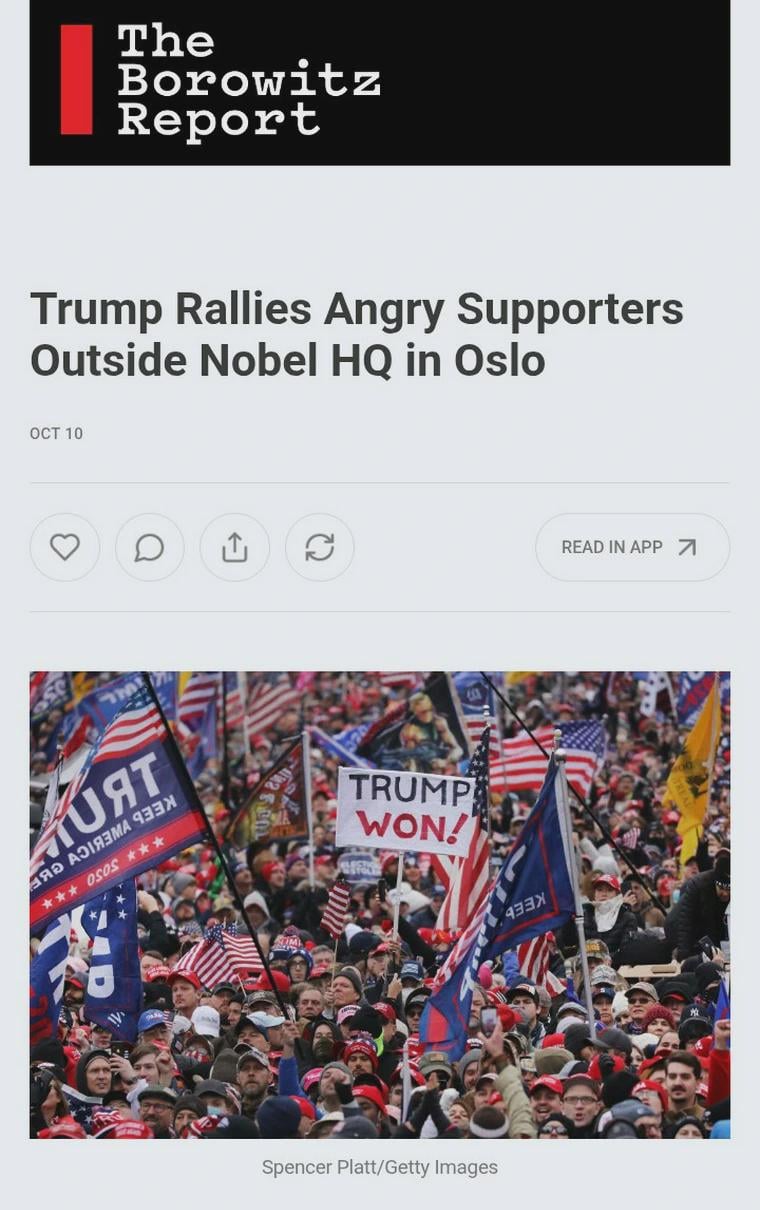 OSLO, NORWAY (The Borowitz Report)—After promising on Truth Social that the gathering would be “wild,” on Friday Donald J. Trump summoned angry supporters to a rally outside the headquarters of the Norwegian Nobel Committee.